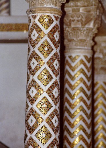 Capitelli corinzi di gusto classicheggiante, ma di epoca posteriore, sorreggono l'architrave anch'esso impreziosito da decorazioni musive e sovrastato da una cornice dalla quale si affacciano sporgenti foglie di acanto