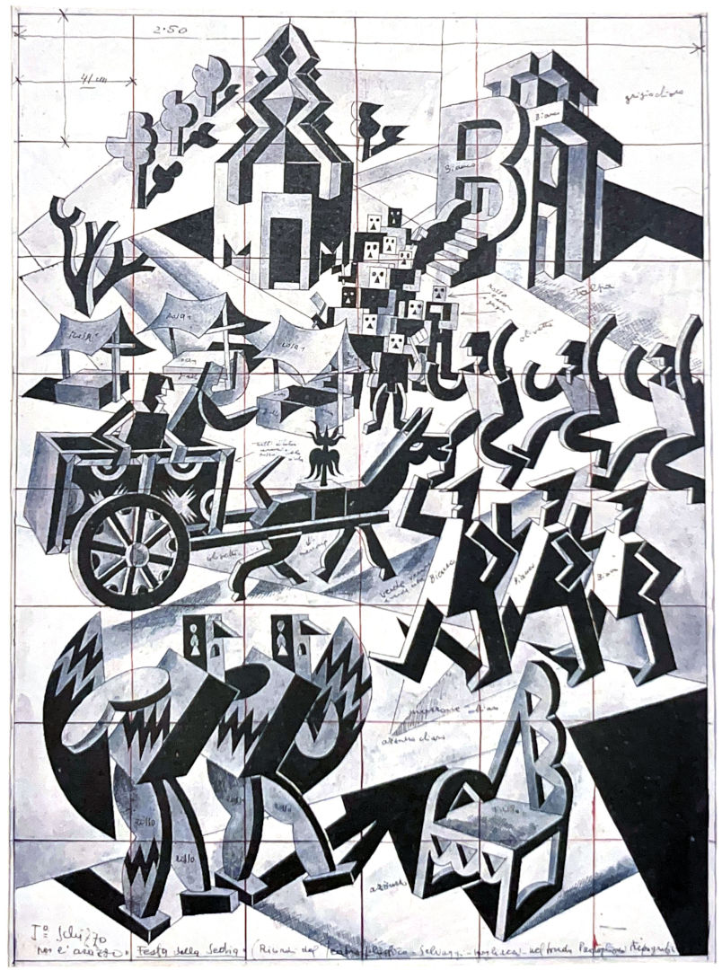 un'architettura pubblicitaria ... in cui l'artista futurista ha “inventato' un alfabeto tridimensionale che da logo si faceva totem e le cui lettere diventavano addirittura complementi d'arredo ... al